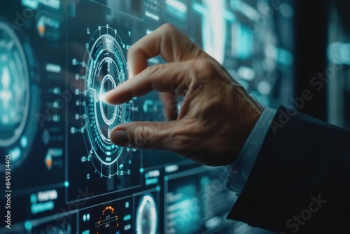 A person's finger is pressing a button on a computer screen