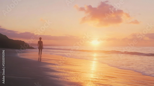 A person's silhouette stands on a beach at sunset, with gentle waves lapping at the shore.