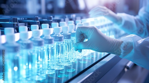A pharmaceutical manufacturing plant scientist inspects medicine bottles wearing hygienic gloves. Pharmaceutical machinery working pharmaceutical glass bottle production line