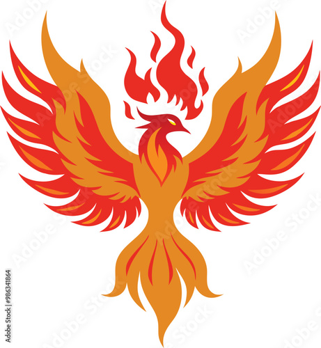 A phoenix rising from flames against a whit background