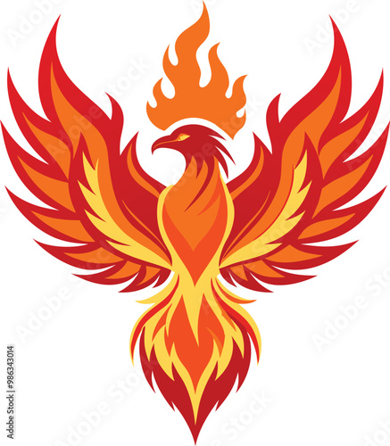 A phoenix rising from flames against a whit background