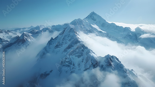 A photo featuring snow-covered Alpine peaks captured from an aerial perspective with a drone. Highlighting the rugged, icy terrain of the mountains, while surrounded by a blanket of pristine snow