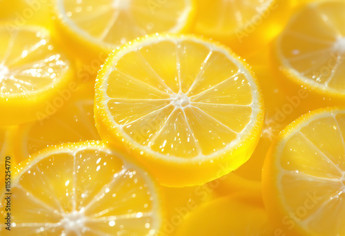 A photo of a collection of translucent, yellow, and crystalline jelly slices of citrus fruits, lemons or oranges