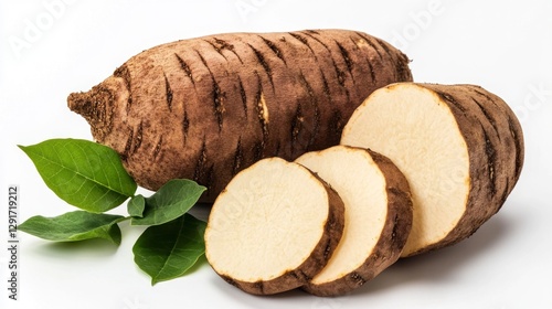 A photo of a large yam, sliced and placed next to the whole one with leaves on a white background.