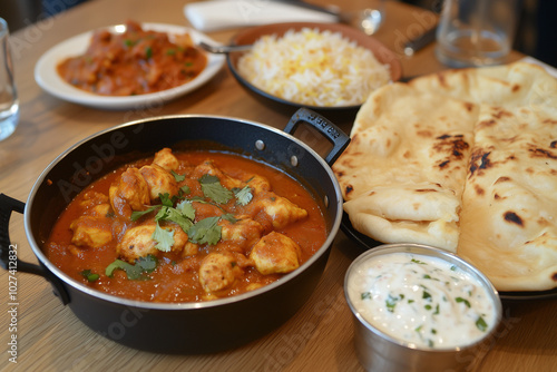 A photo of Indian food, chicken curry in a pot with rice and naan bread on the side, surrounded by other dishes such as lamb biryani, tandoori chicken, and raita sauce.