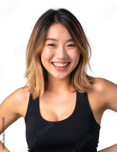 A photograph of a smiling woman with shoulder-length, ombre hair, wearing a black tank top, against a white background.