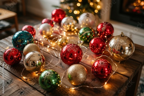 A photograph of a top down arrangement of Christmas globes and fairy lights scattered across a rustic wooden tabletop