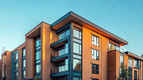 A photograph of an apartment building with modern architecture, showcasing sleek balconies and minimalist design elements against the clear blue sky.