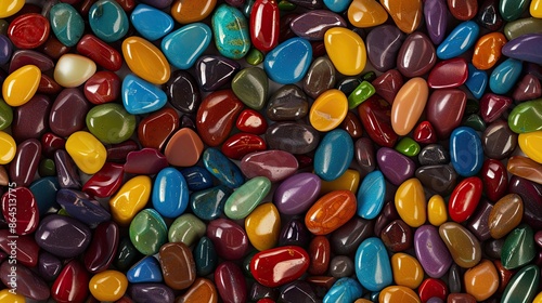 A photograph of many colorful polished river rocks, showcasing their various shapes and textures SEAMLESS PATTERN