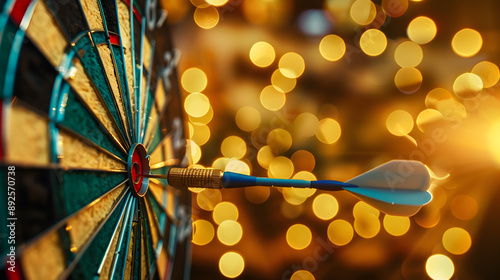 A photograph showcasing a dart precisely hitting the bullseye of a dartboard with a captivating background of golden bokeh lights creating a festive celebratory atmosphere