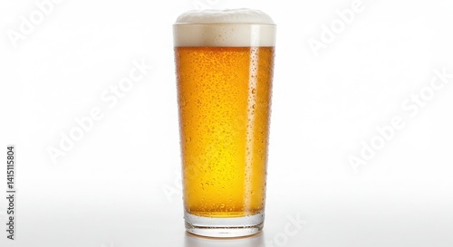 A photorealistic commercial shot of a tall pint glass filled with golden beer, showcasing its vibrant amber hue and frothy head with rising bubbles for a fresh, effervescent look