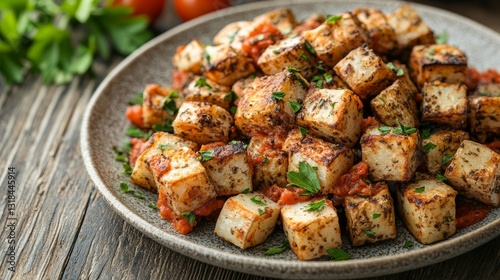 A photorealistic depiction of a shiny plate of patatas bravas featuring crispy potatoes in a spicy tomato sauce on a white plate, garnished with parsley, ideal for a luxurious appetizer