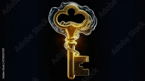 A photorealistic image of a golden key with an ethereal, glowing liquid effect flowing through its design.