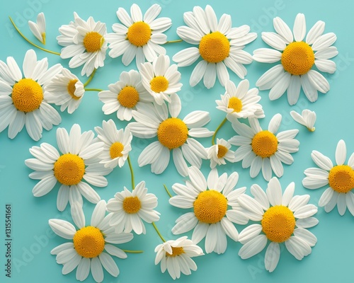 A photorealistic image of white daisies with yellow centers on a soft turquoise background, creating a serene atmosphere.