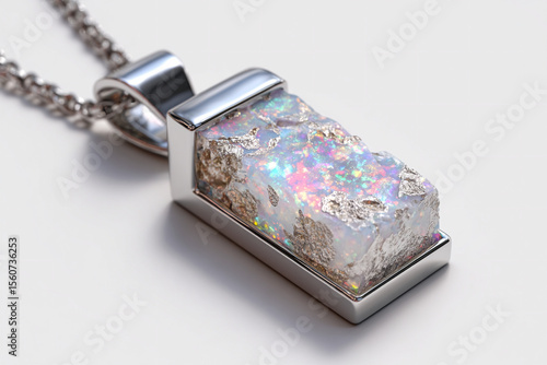 photorealistic, modern, silver, pendant, lightly, raw, opal, iridescent, white