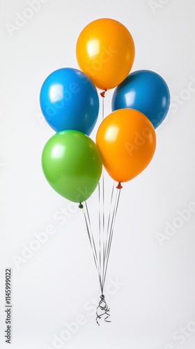 A photostock of multiple colorful helium balloons floating with thin ribbons, isolated on a clean white background, cheerful and festive, High Quality