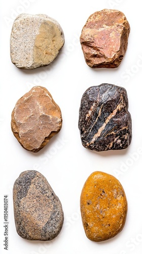 A photostock of rustic stone textures in various shapes and sizes, earthy and bold, isolated on a clean white background, High Quality