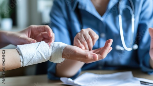 medicals, exam, health care, professional, patient, care, clinic, setting, surgical, bandage, first, aid, wrist, injury, physician, attentiveness, consultation, session, nurse, assistance, interaction, rehabilitation, diagnosis