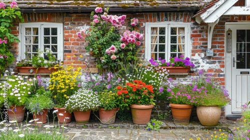 A picturesque country cottage with a garden of flower pots filled with roses and daisies.