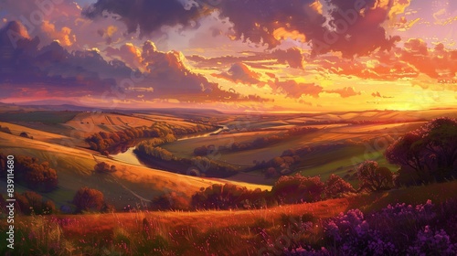 A picturesque countryside scene with rolling hills and a winding river, the sky above painted in hues of orange and purple.