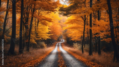 A picturesque dirt road winding through a forest featuring vibrant foliage. Golden and orange leaves create a colorful tunnel, evoking a peaceful and nostalgic vibe. An ideal location for hiking or...