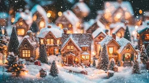 A picturesque snowy village scene with charming houses, twinkling lights, and a magical winter atmosphere.