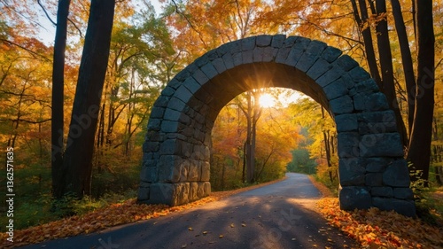 A picturesque stone archway in a vibrant autumn forest, framing a tranquil road.