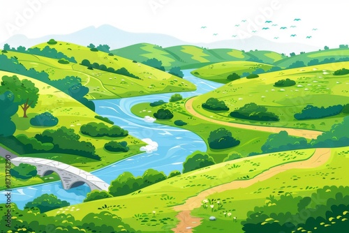 A picturesque valley with a meandering river and a charming bridge, surrounded by lush greenery. The perfect spot to relax and unwind.