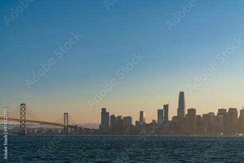 A picturesque view of The Bay Bridge and San Francisco Skyline Panorama at sunset golden hour from Treasure Island, California, United States. Cityscape with mist and foggy air.