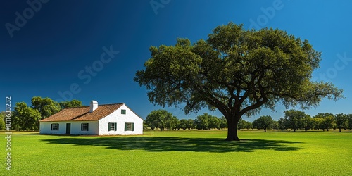 A picturesque white farmhouse sits under the blue sky, casting shadows alongside a large oak tree on a vibrant green lawn in a serene rural setting