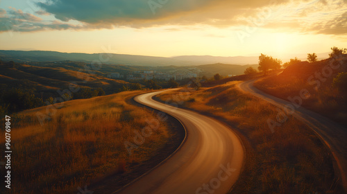 A picturesque winding road stretches through rolling golden hills at sunset, with a distant town visible on the horizon, offering a peaceful, scenic drive