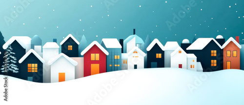 A picturesque winter scene featuring colorful snow-covered houses under a serene blue sky, evoking a cozy, festive atmosphere.