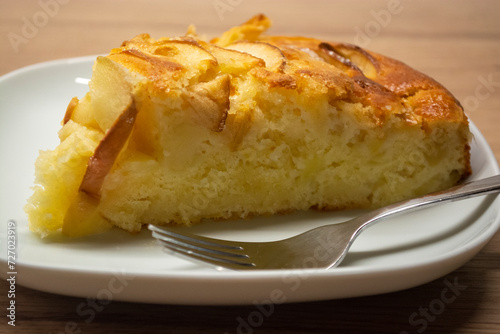 A piece of apple pie on a white plate and a fork. Baking Apple Pie