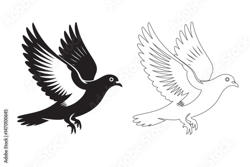 A Pigeon in Flight, Rendered as a Black and White Vector Illustration with Detailed Wings.
