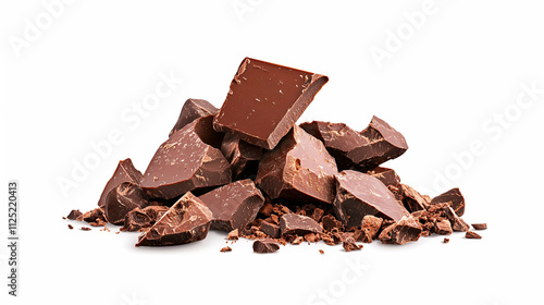 A pile of broken dark chocolate chunks on a white background, showcasing rich textures and colors ideal for food photography.