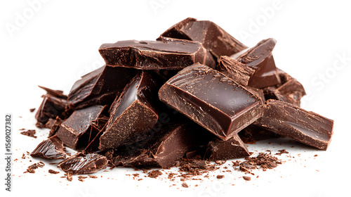 A pile of chocolate pieces on a white background