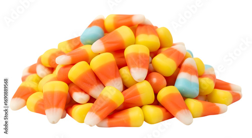 A pile of colorful candy corn, a popular halloween treat, isolated on transparent background
