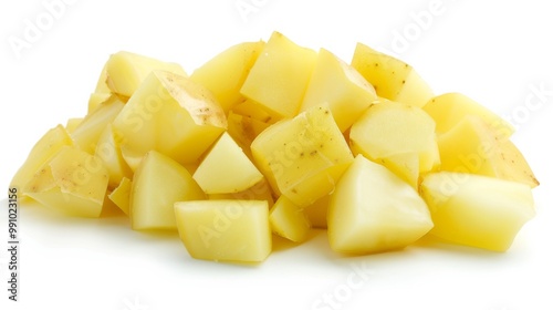 A pile of diced yellow potatoes sits against a white background, showcasing their freshness and readiness for cooking.