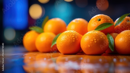 a pile of fresh, ripe oranges, vibrant and juicy, against a blurred background with colorful bokeh lights, photorealistic, high resolution, 8k