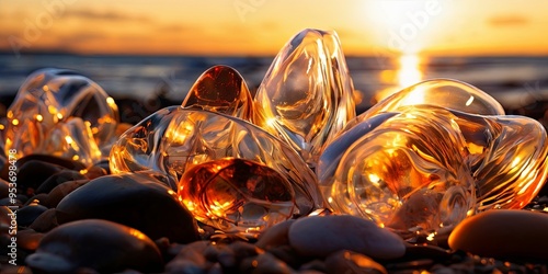 A pile of glass beads on a beach at sunset