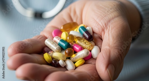 A pile of pills in an elderly hand, Taking pills in old age, Pension and pills, Pills for adults, Medical care for the elderly, Health. High quality