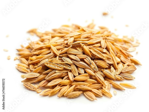 A pile of rice grains on a white background. The grains are small and scattered, with some overlapping each other. Concept of abundance and variety, as the rice grains come in different shapes