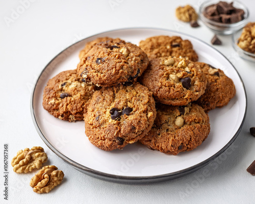 A pile of vegan oatmeal cookies with chocolate chips and walnuts, featuring a clean white backdrop, ai.