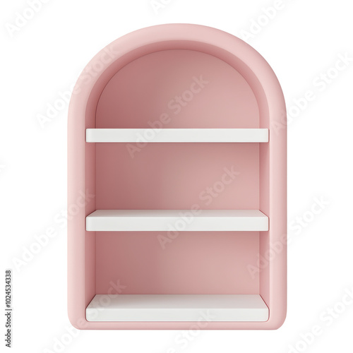 A pink 3D arched bookshelf featuring a minimalistic design. This modern shelf unit adds a soft, elegant touch to contemporary interiors. Isolated on transparent background, png.