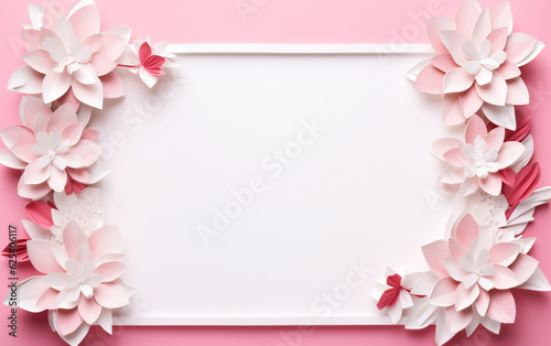 A pink and white paper photo frame with flowers on it