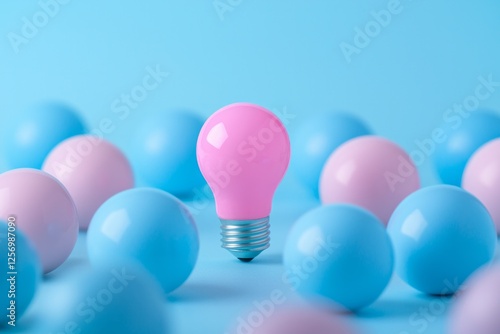 A pink light bulb stands out from the crowd of blue ones, against a pastel-colored background.