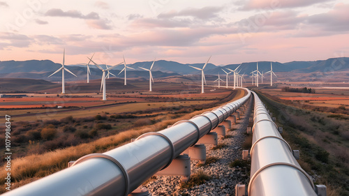 A pipeline winds through a picturesque landscape, carrying clean energy from a wind farm to power homes and businesses