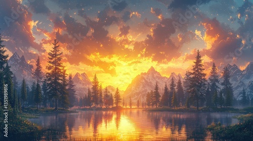 pixel, art, masterpiece, where, evergreen, tree, their, branch, reaching, toward, sky, painted, gentle, gold, cloud, stood, majestically, against, layered, mountain, peak, reflecting, tranquil, lake, creating, serene, captivating, scene, sunset, water, nature, landscape, cloud, blue, evening, dusk, morning, orange, dawn, summer, beautiful, red, calm, forest
