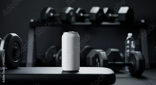 A plain energy drink can mock-up, standing on a gym bench with workout equipment in the background 3d illustration template image.