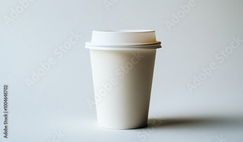 A plain white coffee cup with a lid placed against a clean, minimalist white background, symbolizing simplicity, takeaway drinks, and modern design.